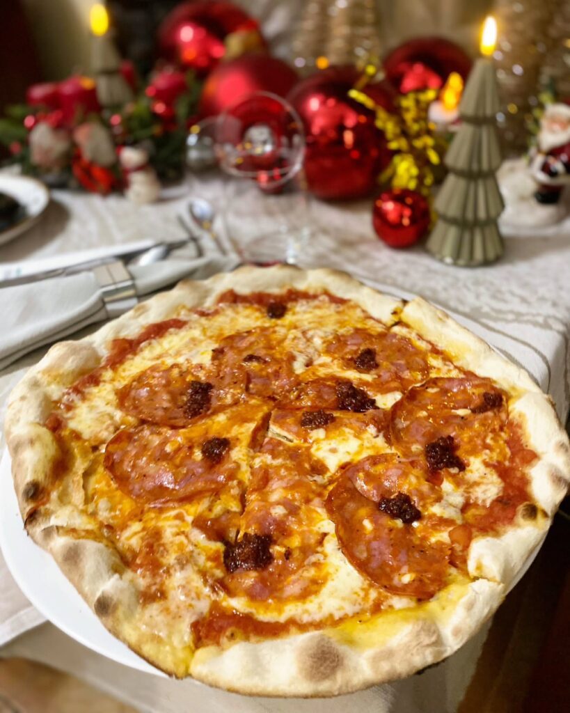 Calabra 15. októbra 2020 Nekomentované paradajková omáčka, mozzarella, pikantná saláma, N´Duja tomato sauce, mozzarella, hot salami, N´Duja pomodoro, mozzarella, salame piccante, N´Duja 580g