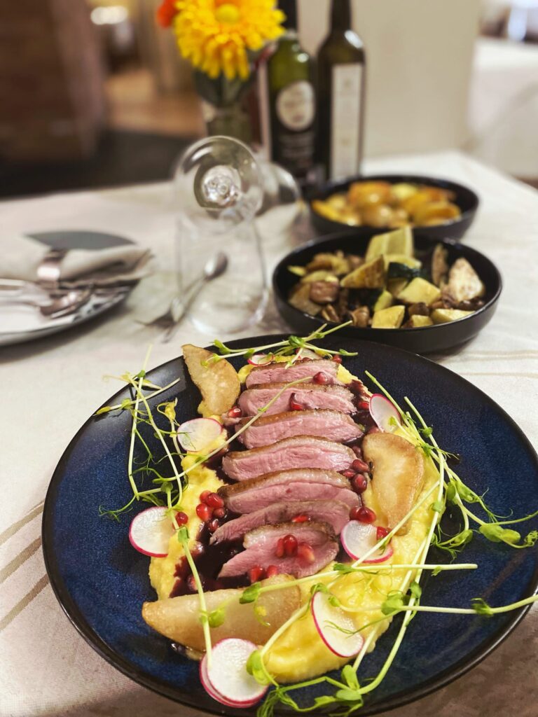 Petto di anatra alla griglia, pure di mango pera fritta e salsa al vino rosso